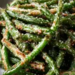 Crispy air-fried green beans coated in Parmesan cheese, offering a healthy and delicious side dish perfect for any occasion.