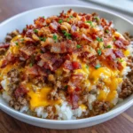 Imagine walking into your kitchen, the air thick with the irresistible aroma of sizzling bacon, mingling with the savory scent of ground beef browning to perfection. As you lift the lid off your skillet, a wave of warmth envelops you, revealing a bubbling pot of creamy rice, glistening with melted cheddar cheese. The sight alone is enough to make your mouth water, and the anticipation of that first bite is almost too much to bear!