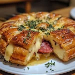 Baked Brie en Croûte with Honey, Thyme & Crispy Salami is a delicious and elegant appetizer that combines the creamy richness of Brie cheese with the sweetness of honey, the earthiness of thyme, and the crunch of crispy salami, all wrapped in a flaky pastry crust.