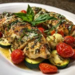 Baked Herb Chicken with Zucchini & Cherry Tomatoes is a vibrant dish that bursts with flavor. The tender, juicy chicken is infused with aromatic herbs, while the roasted zucchini and sweet cherry tomatoes add a delightful contrast in texture and a hint of sweetness.