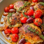 The dish’s vibrant colors and rich flavors make it perfect for any occasion – from a cozy family meal to an elegant dinner party. The combination of succulent chicken, luscious tomatoes, aromatic herbs, and the complement of tangy olives brings new life to your dining table. It stands out not just for its taste but also for how effortlessly it transports you to a sunlit café in Provence.