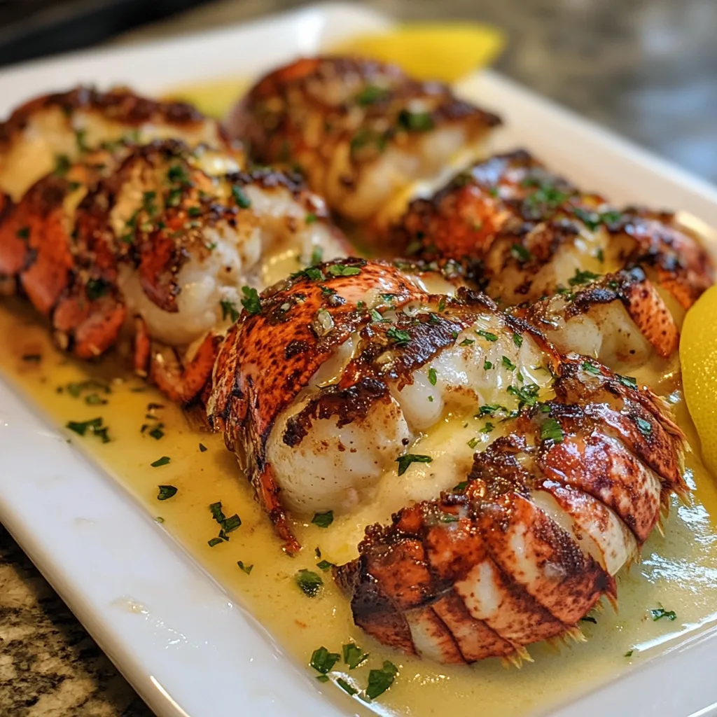Delicious broiled lobster tails served in a rich and creamy garlic butter sauce, perfect for a special occasion or a luxurious dinner.
