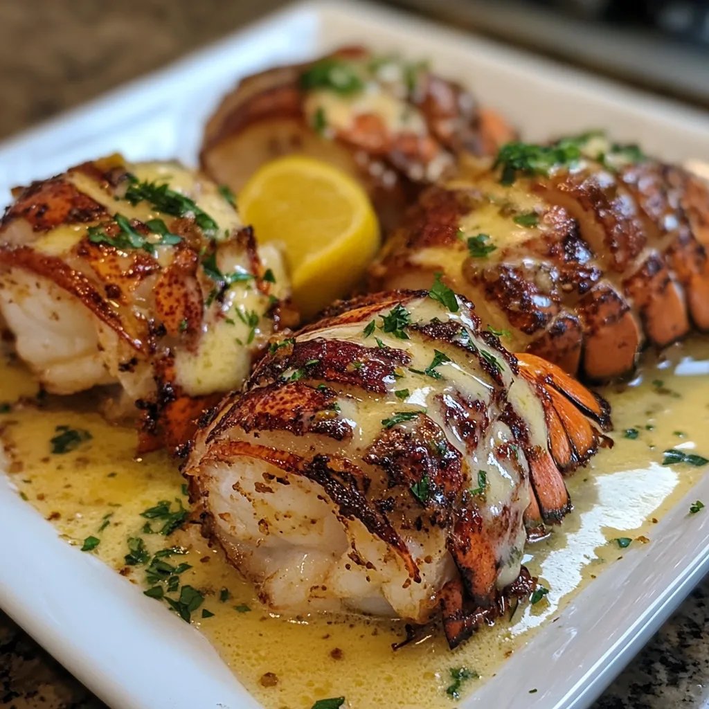Keywords: Broiled Lobster Tails, Creamy Garlic Butter Sauce, Seafood Recipe