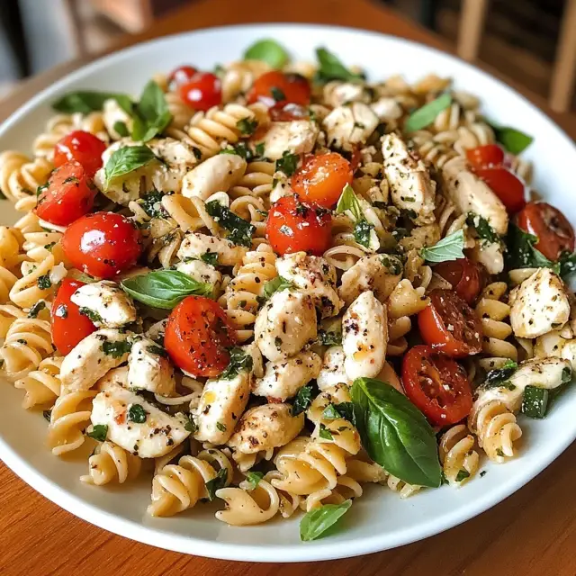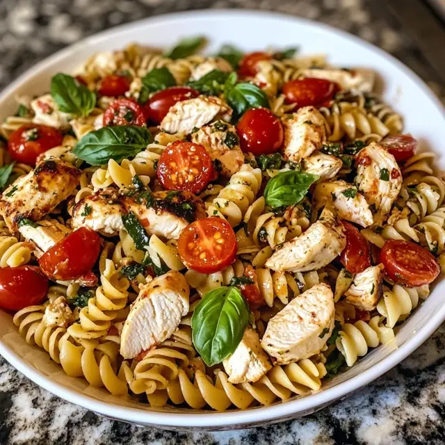 A refreshing and vibrant pasta salad featuring tender chicken, fresh mozzarella, juicy tomatoes, and fragrant basil, all tossed in a light balsamic dressing.