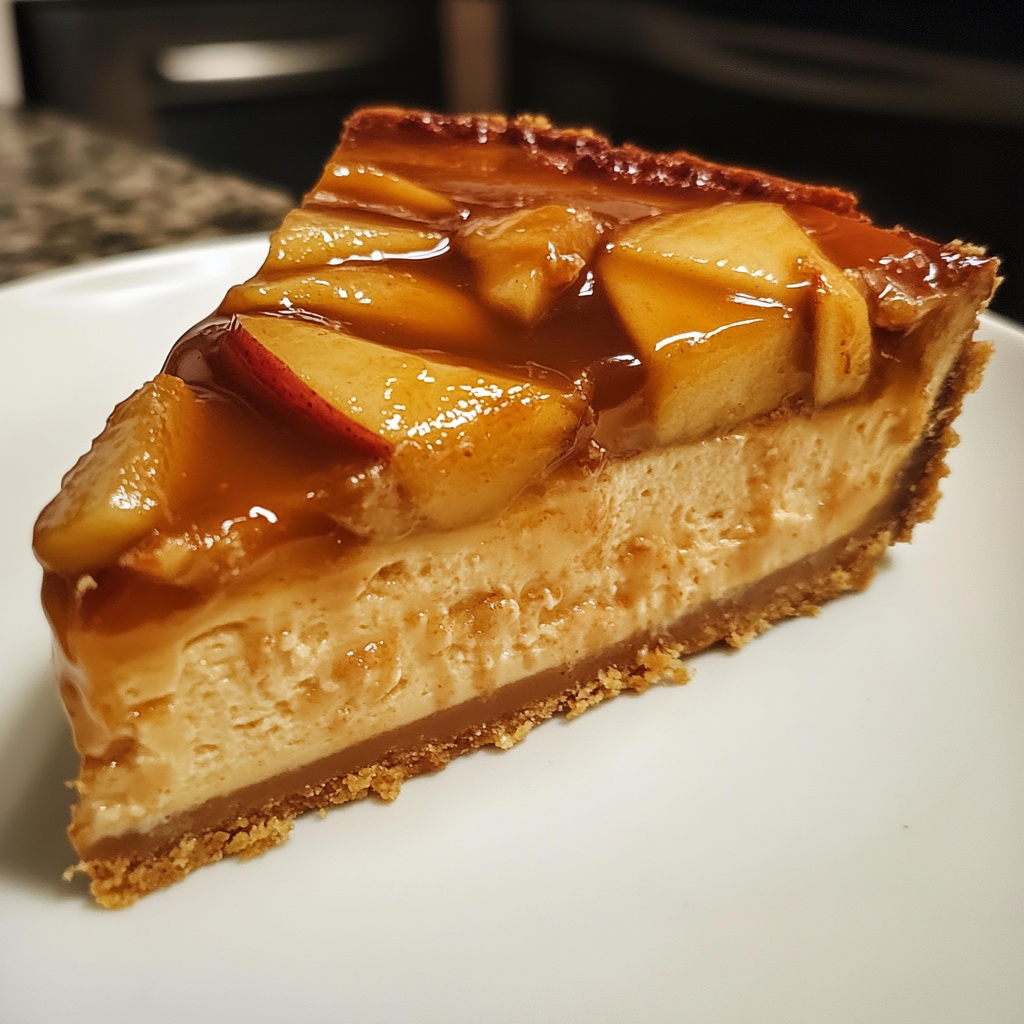 A deliciously rich and creamy cheesecake topped with caramel and apple slices, perfect for dessert lovers.