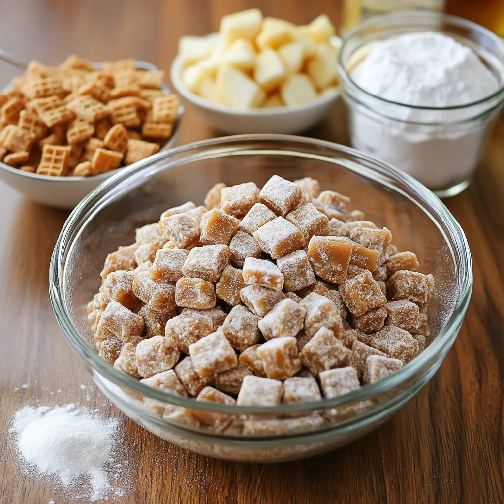 Gathering the right ingredients is the first step to creating your Caramel Apple Puppy Chow. Here’s what you’ll need: