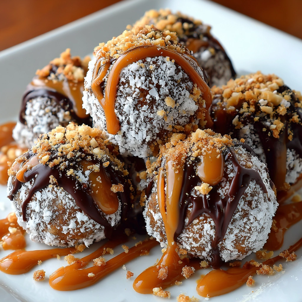 Chocolate Peanut Butter Snowballs with Caramel Drizzle