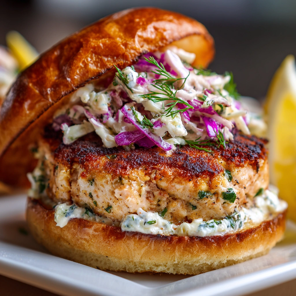 Crispy Salmon Burgers with Lemon Dill Slaw