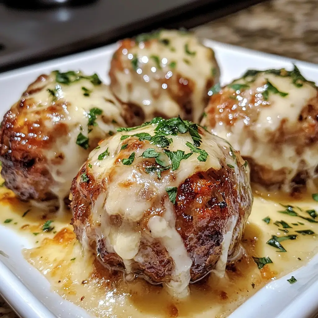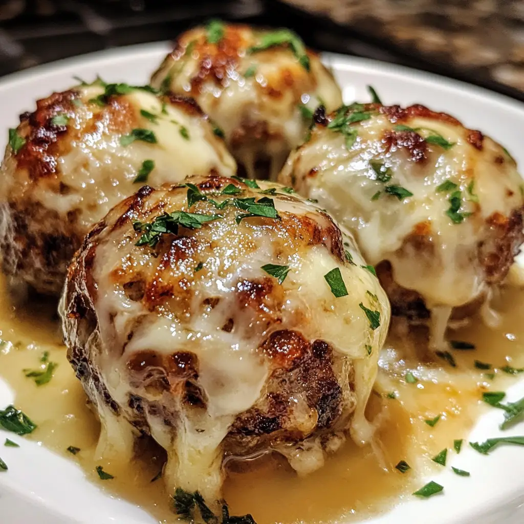 Delicious meatballs infused with the rich flavors of French onion soup and topped with gooey cheese.