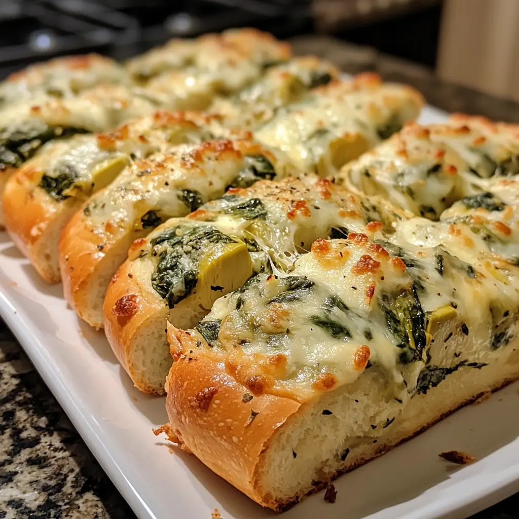 A delicious and cheesy bread stuffed with spinach and artichokes, perfect for parties or as a snack.