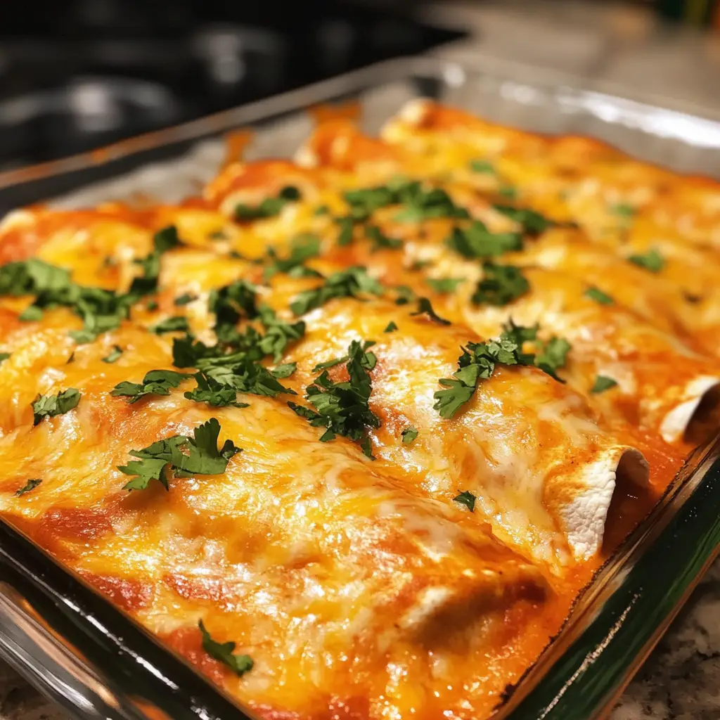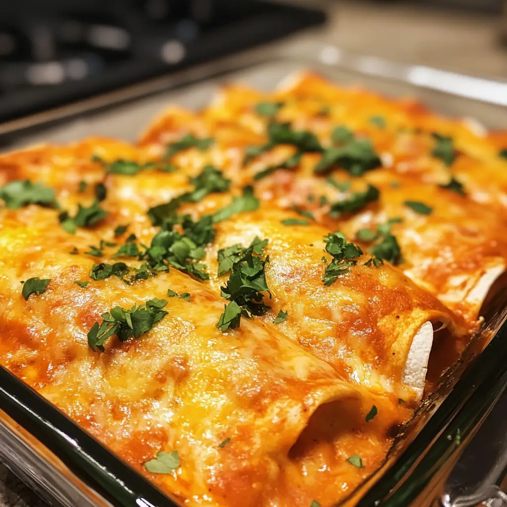 Once all your enchiladas are in the dish, pour the remaining enchilada sauce over the top and sprinkle with shredded cheese. Pop the dish into your preheated oven and bake for 20-25 minutes. You’ll know they’re done when the cheese is melted and bubbly, creating a golden, cheesy crust that’s simply irresistible!