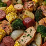 As you approach the oven, the enticing aroma of roasted chicken mingles with the savory notes of sausage, filling your kitchen with a warmth that feels like a cozy hug. You can practically hear the satisfying sizzle of juicy chicken as it cooks alongside perfectly tender baby potatoes, vibrant green broccoli, and sweet pops of corn. The foil packets puff up like little treasure chests, each one promising a delightful explosion of flavors and textures that will make your mouth water. It’s more than just a meal; it’s an experience, a colorful tableau that brings together family and friends around the dinner table with joy and enthusiasm.