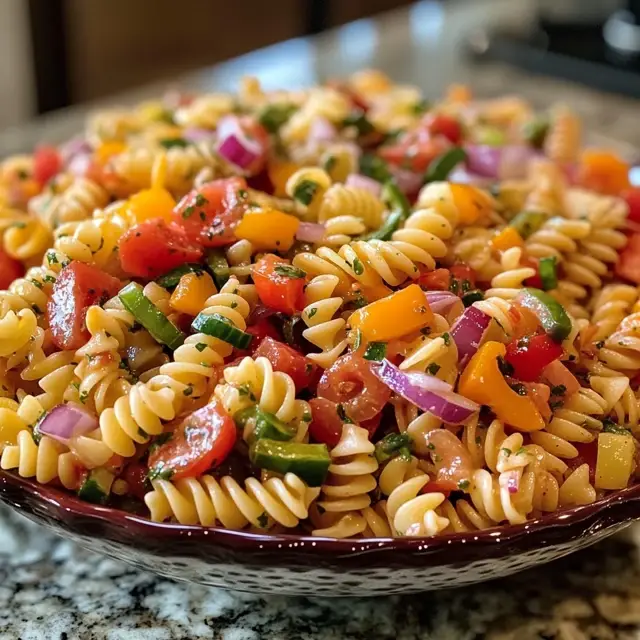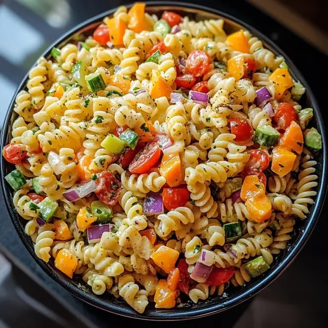 A refreshing and colorful classic pasta salad that is perfect for picnics and gatherings, featuring a secret ingredient that elevates its flavor.