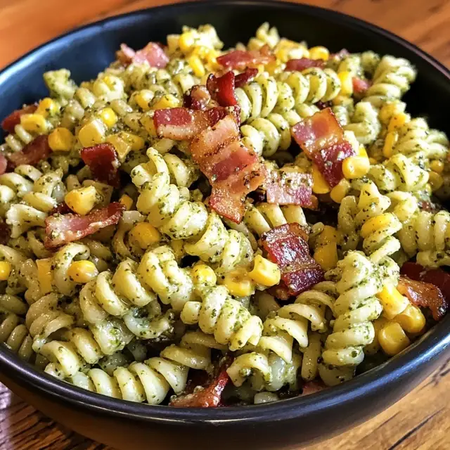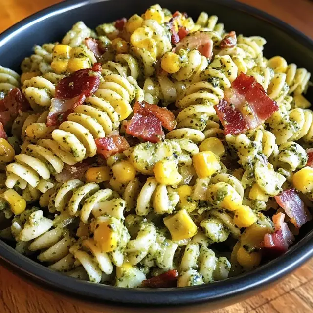 A delicious and refreshing corn pasta salad featuring crispy bacon and a creamy pesto dressing, perfect for summer gatherings.