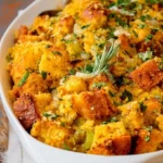 This cornbread stuffing, steeped in warmth and rich flavors, is sure to become a beloved star at your table. The combination of crisp cornbread, succulent herbs, and that comforting buttery sauce will create a dish that draws everyone in for seconds, if not thirds! As you prepare to share this with loved ones, remember, food is not just about sustenance; it’s about the connections we build, the stories we tell, and the memories we create around a shared meal. So roll up your sleeves, gather your ingredients, and let the magic of cooking bring joy to your heart and your home. Happy cooking!