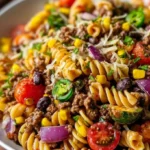 A vibrant pasta salad featuring ground beef, colorful vegetables, and a creamy dressing, perfect for summer gatherings.