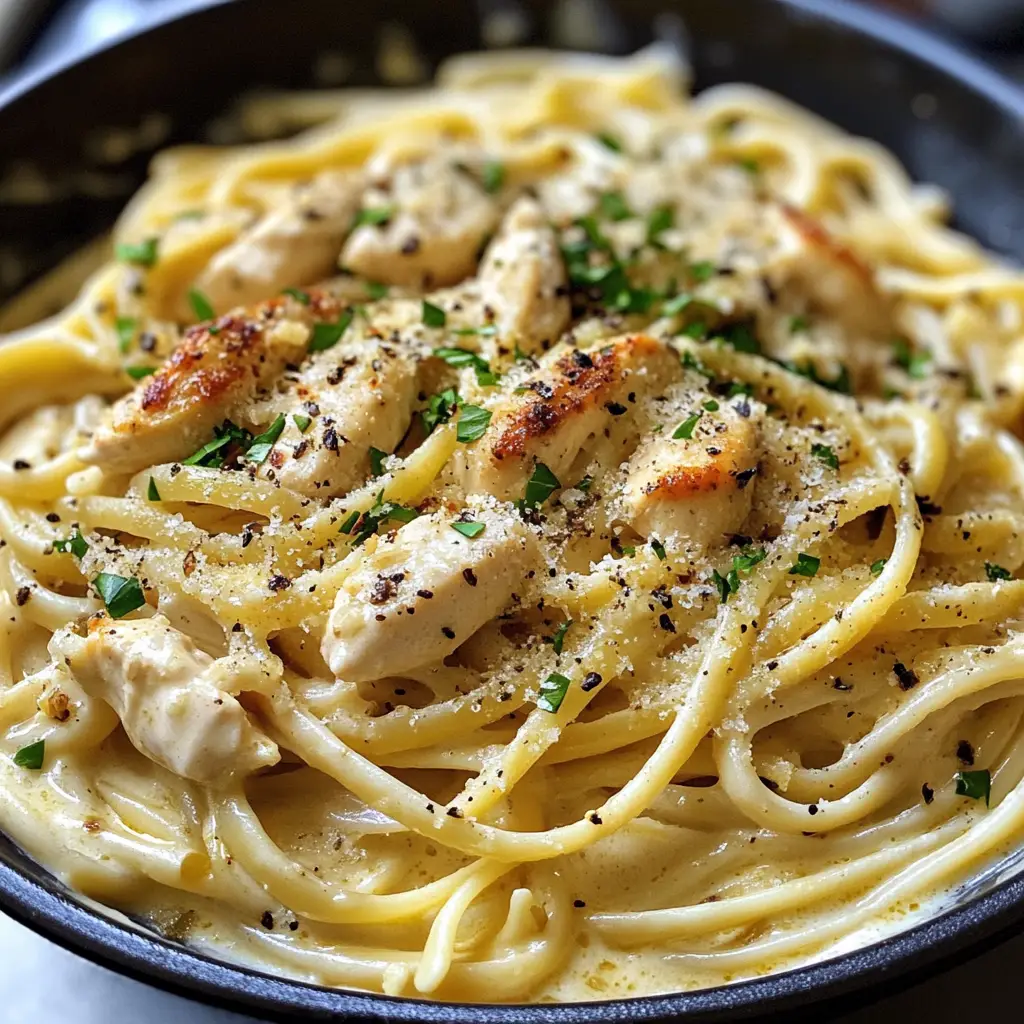 A delicious and creamy pasta dish featuring tender chicken, garlic, and Parmesan cheese, perfect for a comforting meal.