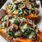 A warm and comforting dish featuring sweet potatoes stuffed with a creamy mixture of sautéed mushrooms and fresh spinach, topped with melted cheese.
