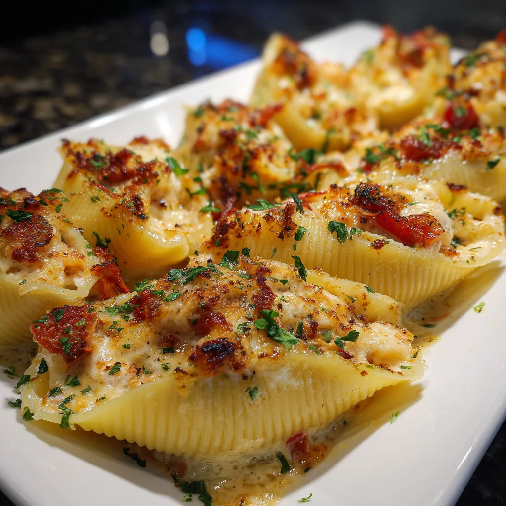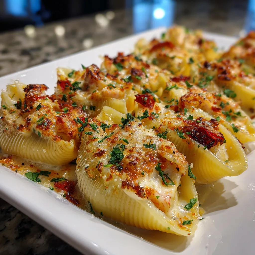 Delicious and creamy stuffed pasta shells filled with a savory seafood mixture, perfect for a comforting meal.