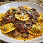 Imagine a plate of Creamy Tomato Mushroom Ravioli with Seared Steak sitting before you, steam rising gently, inviting you to dive in. The ravioli, with their delicate, silky texture, are enveloped in a rich, vibrant tomato sauce that glistens under the light. Each bite reveals a luscious filling of creamy ricotta and earthy mushrooms, perfectly balanced by the tangy sauce. And then there’s the steak—juicy, perfectly seared, and bursting with flavor, it adds a hearty contrast to the dish. The aroma wafts through the air, a tantalizing blend of garlic, herbs, and the savory scent of grilled meat, making it impossible to resist.
