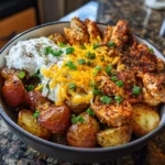 Keywords: Crispy Potato and Chicken Bowl, chicken bowl recipe, crispy potatoes, easy dinner, comfort food, savory chicken, roasted potatoes, quick meal, family-friendly recipe, gluten-free dinner, hearty bowl, delicious chicken, homemade comfort food, satisfying meal
