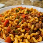 A comforting and savory one-pot dish featuring ground beef, elbow pasta, and colorful vegetables, perfect for busy weeknights.