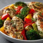 Now it’s time to bake! Place the baking sheet in the preheated oven and let it cook for 25-30 minutes. Keep an eye on it! The chicken should reach an internal temperature of 165°F (75°C) to ensure it’s fully cooked. The veggies should be tender and slightly caramelized, adding to the dish’s overall flavor.
