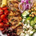 Keywords: Greek chicken bowl, Mediterranean recipe, healthy bowl meal, quinoa bowl, grilled chicken