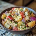 In a large mixing bowl, combine the cooled potatoes with the cherry tomatoes, diced cucumber, finely chopped red onion, sliced Kalamata olives, and crumbled feta cheese. Gently toss everything together, being careful not to mash the potatoes. The colors will be stunning, and the aroma will make your mouth water!