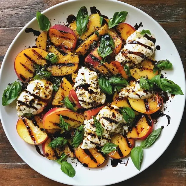Keywords: Grilled Peach, Burrata Salad, Basil, Balsamic Drizzle, Summer Salad
