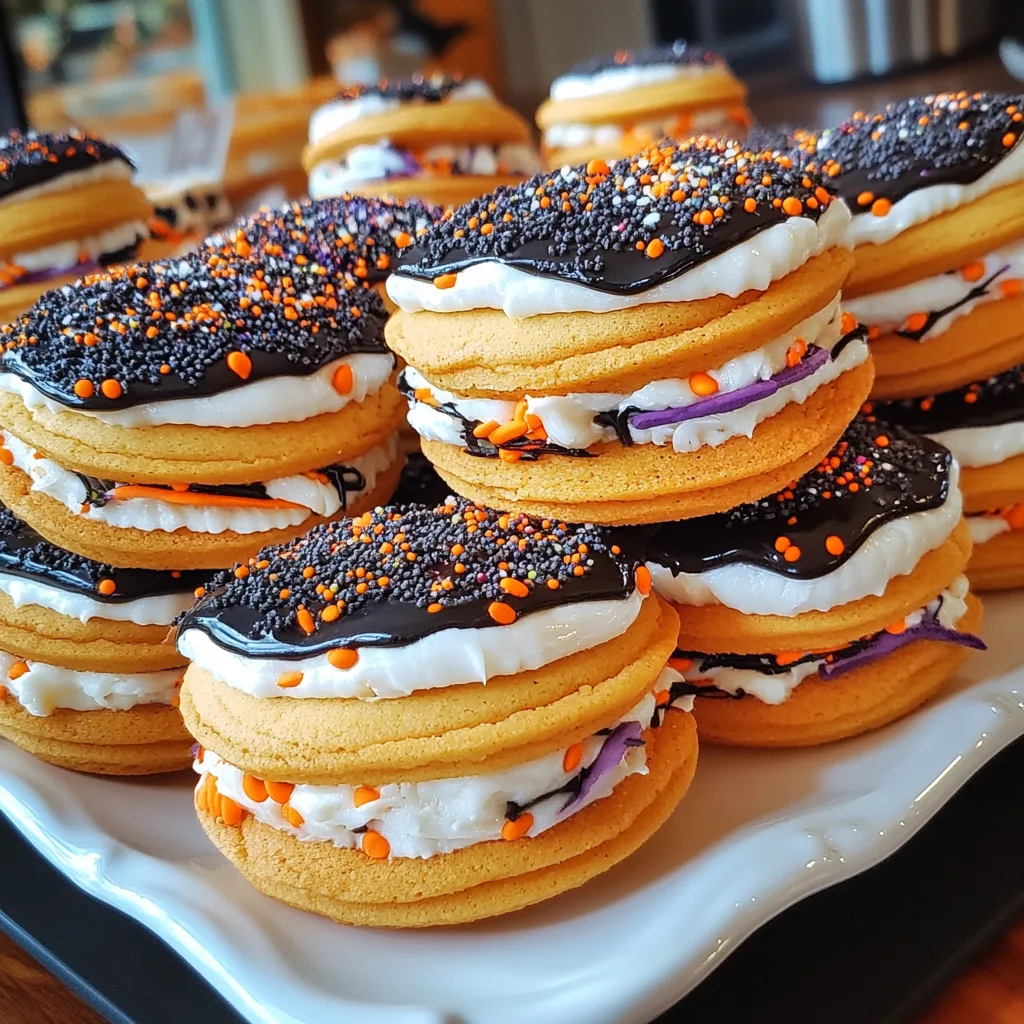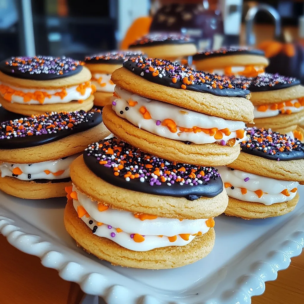 Delicious and festive Halloween sugar cookie sandwiches filled with creamy frosting, perfect for celebrating the spooky season.