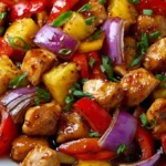 A vibrant combination of succulent chicken, colorful bell peppers, and juicy pineapple, all roasted to perfection on a single sheet pan.