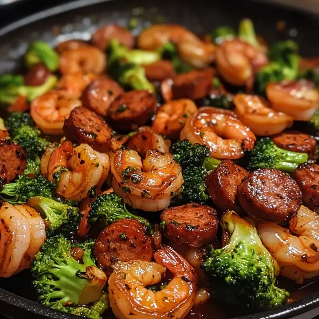 A delicious and easy-to-make dish featuring shrimp, sausage, and broccoli tossed in a sweet and savory honey garlic sauce.