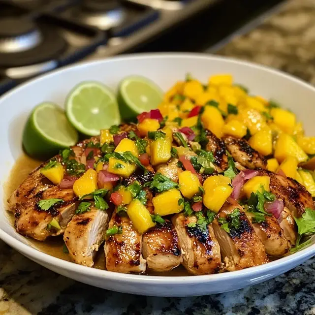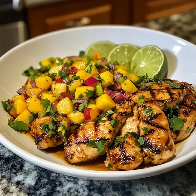 A delicious and refreshing dish featuring grilled chicken marinated in honey and lime, topped with a vibrant mango salsa.