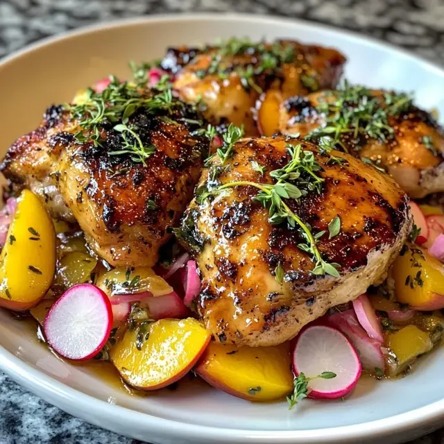 Cooking this Lemon-Peach Chicken with Fresh Thyme & Radish Slaw is more than just preparing a meal; it’s about creating joyful moments around the dinner table. The vibrant flavors and fresh ingredients come together to make a dish that feels special, even on the busiest of nights. I love how it brings my family together, sparking laughter and conversation. Plus, it’s a recipe that’s easy to master, making it a go-to for any occasion. So, roll up your sleeves, embrace the process, and enjoy the delightful experience this dish brings to your home!