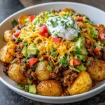 Keywords: Loaded Potato Taco Bowl, crispy potatoes, taco bowl, Mexican-American cuisine, comfort food, easy dinner, gluten-free recipe, savory toppings, quick meal, family-friendly, hearty dish, flavorful bowl