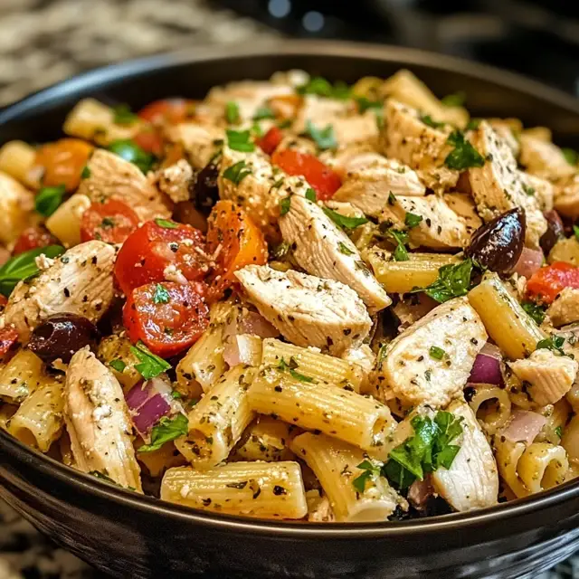 A refreshing and flavorful Mediterranean Chicken Pasta Salad that combines tender chicken, fresh vegetables, and a zesty dressing.