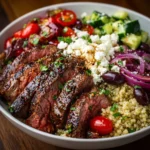 Keywords: Mediterranean Steak Bowl, healthy steak recipes, quinoa salad, Mediterranean cuisine, grilled steak, easy dinner recipes, gluten-free meals, fresh vegetables, summer recipes, protein-packed meals, flavorful bowls, meal prep ideas