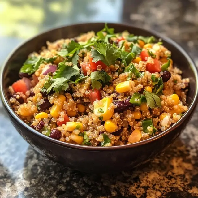 Once your quinoa is cooked and cooled slightly, it’s time to mix! In a large bowl, combine the fluffy quinoa with corn, diced red bell pepper, red onion, and fresh cilantro. This colorful mix not only looks beautiful but also brings a variety of flavors and textures to your salad.