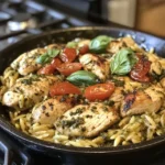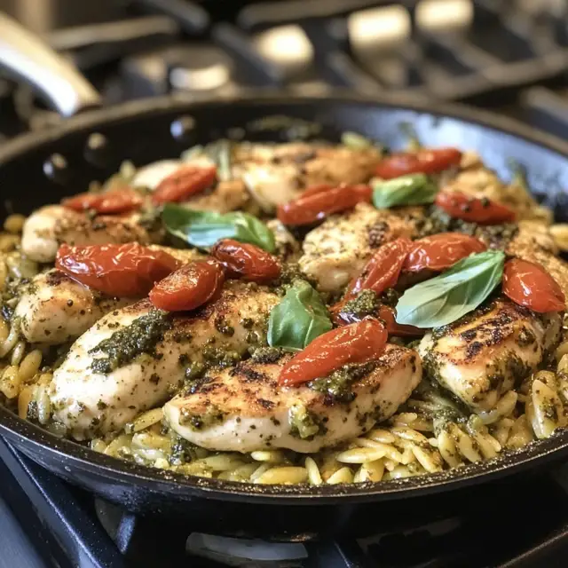 One Pan Chicken & Pesto Orzo is a quick and delicious dinner option that combines tender chicken with flavorful pesto and creamy orzo pasta, all cooked in one pan for easy cleanup.