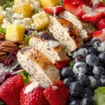 This salad stands out with its delightful combination of fresh fruits, tender chicken, and a creamy dressing that unites the ingredients in such harmony that they each shine. Not only do the vibrant colors and flavors please the eye and tantalize the palate, but the health benefits are equally appealing. Loaded with antioxidants from the berries, protein from the chicken, and healthy fats from the pecans, you enjoy a dish that nourishes the body while also tantalizing the senses. This salad truly invites you to savor life’s simple pleasures.