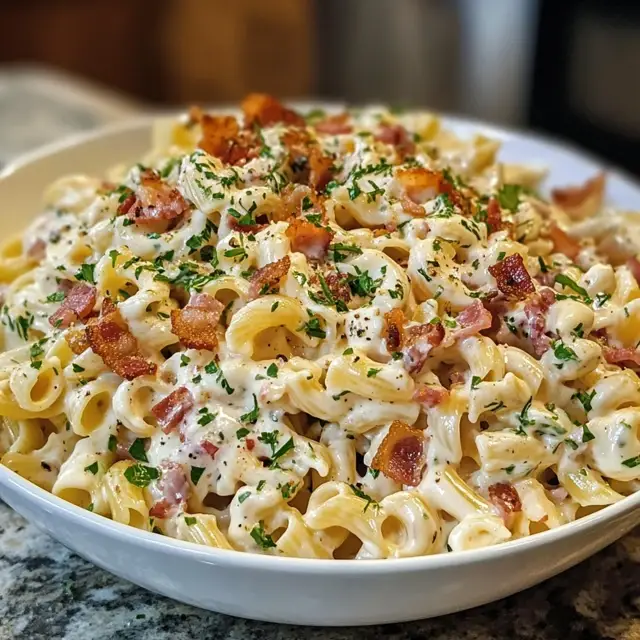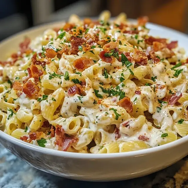A delicious and creamy pasta salad featuring crispy bacon and a tangy ranch dressing, perfect for any gathering.