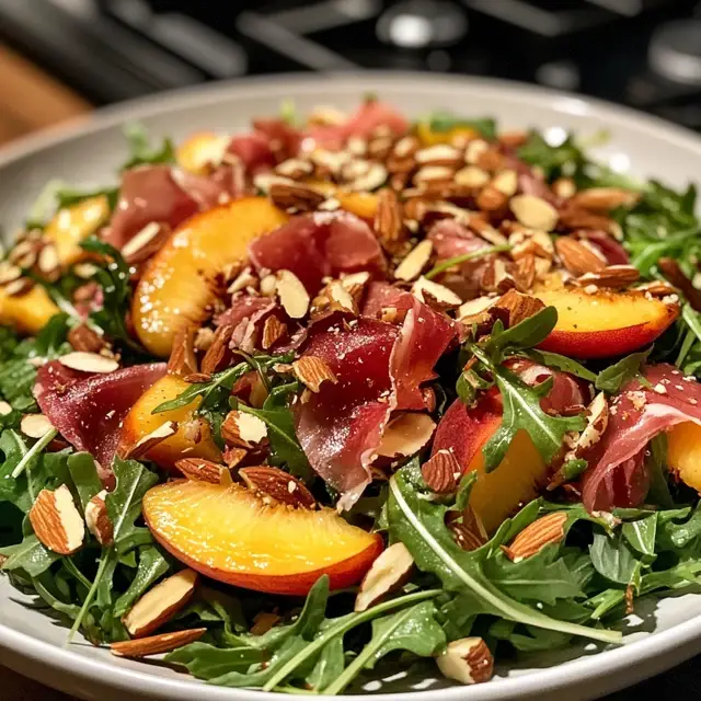 A refreshing salad combining the sweetness of peaches, the peppery flavor of arugula, and the savory taste of prosciutto, topped with toasted almonds for added crunch.
