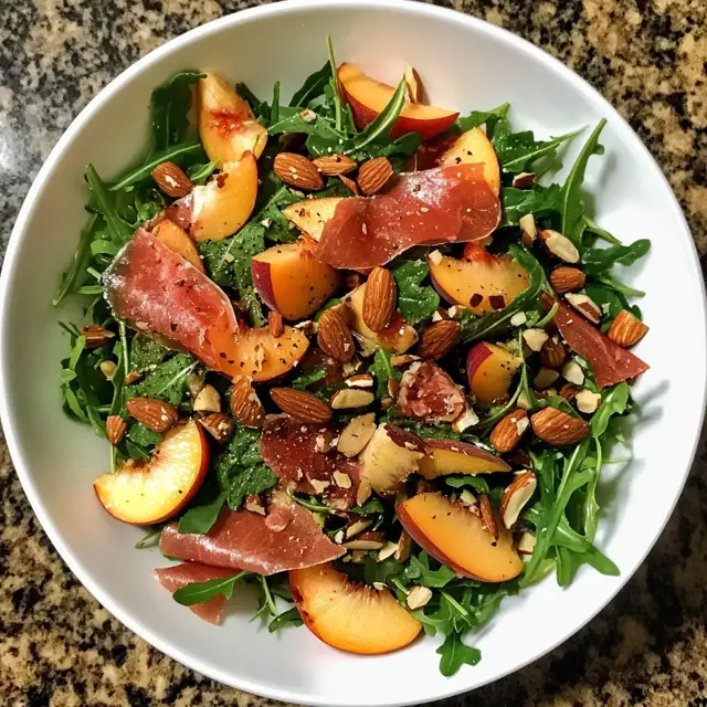 Creating this Peach, Arugula & Prosciutto Salad with Toasted Almonds is more than just a cooking task; it’s a joyful experience that brings people together. The vibrant colors and delightful flavors make it a feast for the eyes and the palate. I love how this salad can transform a simple meal into something special, whether it’s a quick lunch or a dinner party centerpiece. Plus, it’s a reminder that healthy eating can be delicious and satisfying. So, gather your loved ones, share this salad, and savor the moments that come with it. Enjoy every bite!
