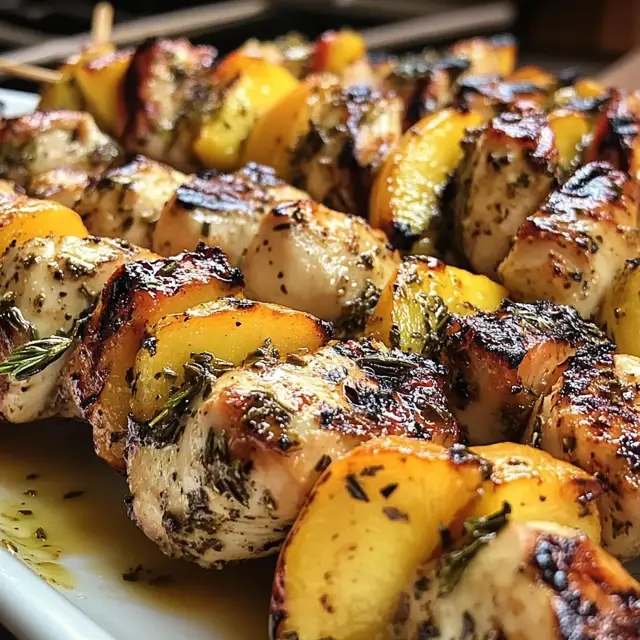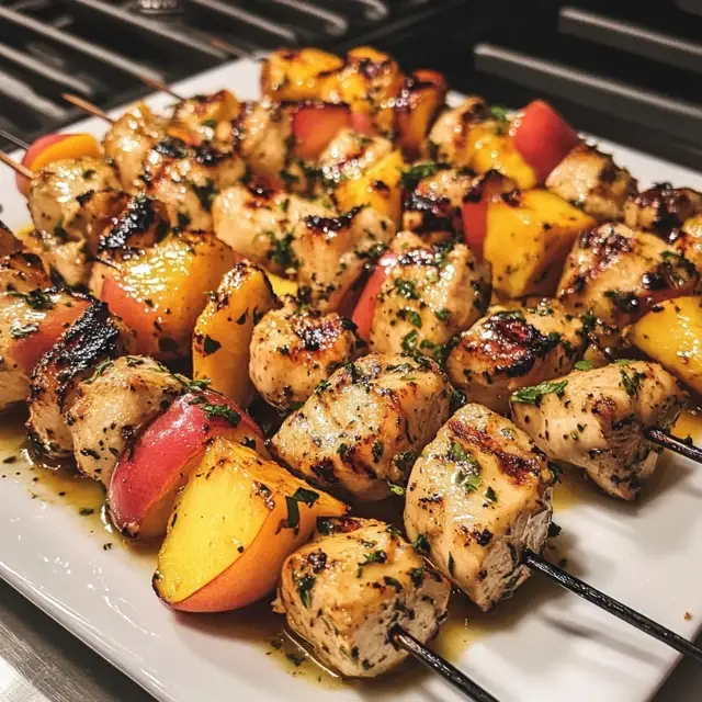 Delicious grilled chicken skewers marinated in a flavorful peach and herb mixture, perfect for summer barbecues.