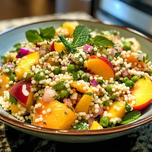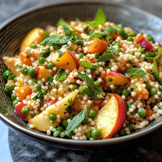 A refreshing and vibrant salad featuring couscous, sweet peaches, fresh peas, and mint, perfect for summer gatherings.