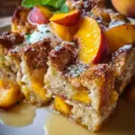 A luscious symphony of creamy custard-soaked bread and caramelized peaches, perfect for brunch or special occasions.