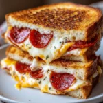 Indulge in the ultimate comfort food with this Pepperoni Pizza Grilled Cheese, where crispy, golden-brown bread encases a melty blend of mozzarella and pepperoni. Each bite bursts with savory flavors, complemented by the rich, buttery texture that makes it irresistibly satisfying.