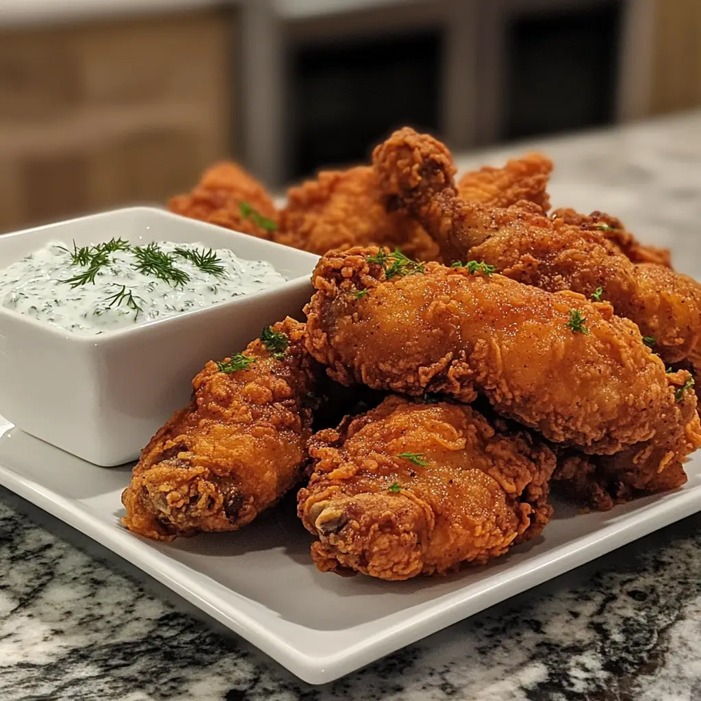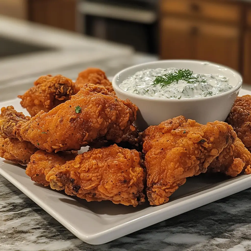 Once your chicken is golden and crispy, it’s time to serve! Place the fried chicken on a platter and serve it hot with the dill dip on the side. For an attractive presentation, garnish with extra dill or lemon wedges. This dish is perfect for family dinners or gatherings, and I guarantee it will be a hit!