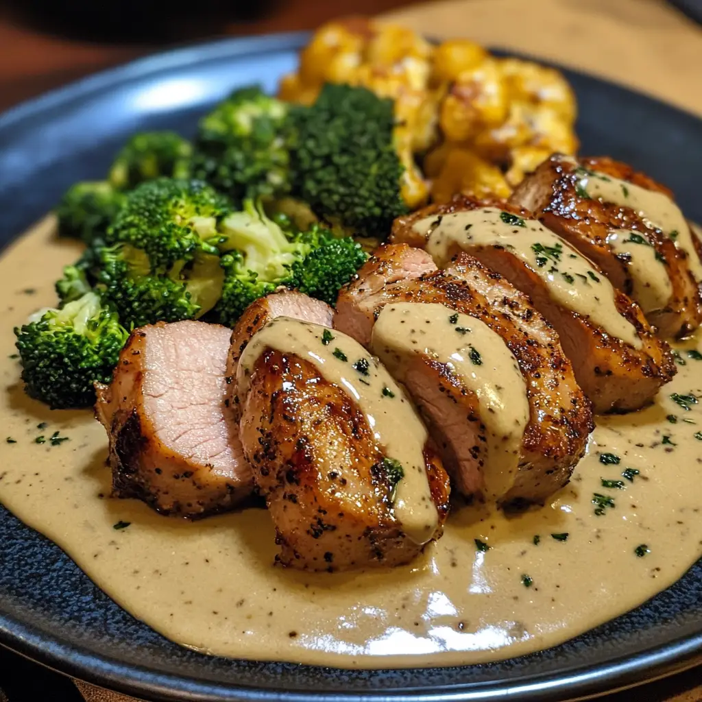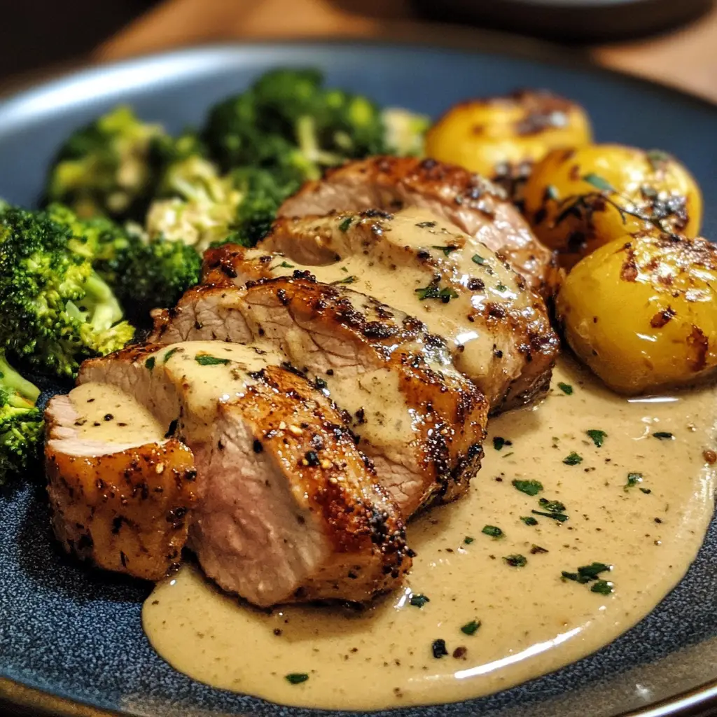 A flavorful pork tenderloin dish served with a creamy Dijon sauce, perfect for a special dinner.